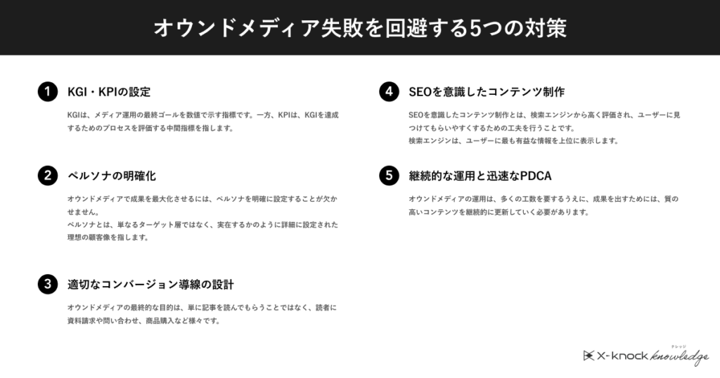 ここでは、オウンドメディアの運用で前述した失敗の共通点に陥ってしまった場合、どのように自社のオウンドメディアを改善していくべきなのか、5つの対策を解説していきます。