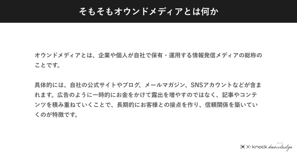 具体的には、自社の公式サイトやブログ、メールマガジン、SNSアカウントなどが含まれます。広告のように一時的にお金をかけて露出を増やすのではなく、記事やコンテンツを積み重ねていくことで、長期的にお客様との接点を作り、信頼関係を築いていくのが特徴です。