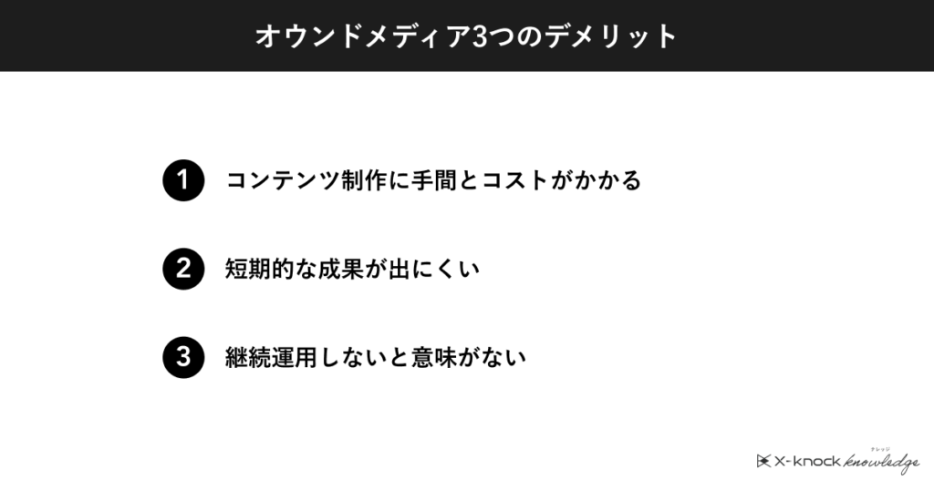 オウンドメディアのデメリットとしては、主に以下の3つがあります。