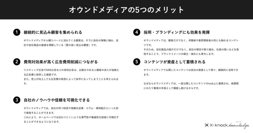 オウンドメディアのメリットには、主に次の5つが挙げられます。