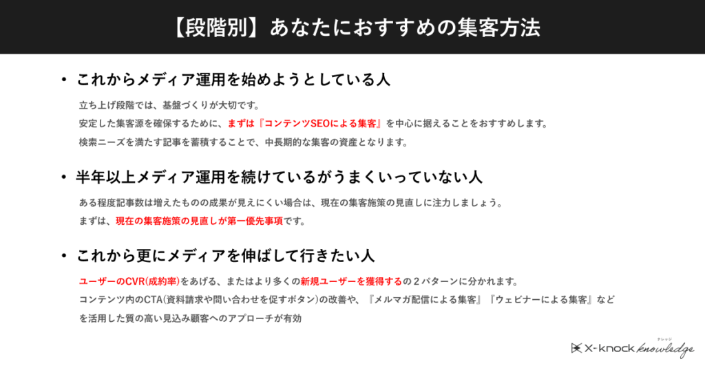 安定した集客源を確保するために、まずは『コンテンツSEOによる集客』を中心に据えることをおすすめします。検索ニーズを満たす記事を蓄積することで、中長期的な集客の資産となります。