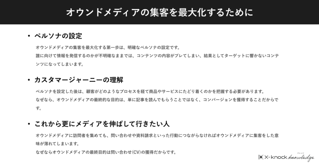 ここでは、オウンドメディアの集客を最大化させるための3つポイントを紹介します。