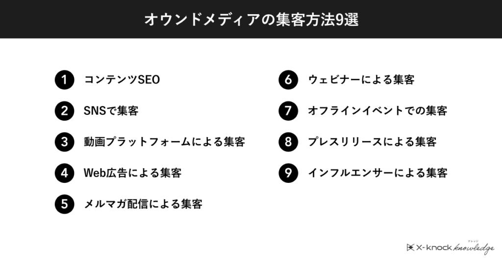 ここではオウンドメディアの集客方法を9つにまとめて解説します。